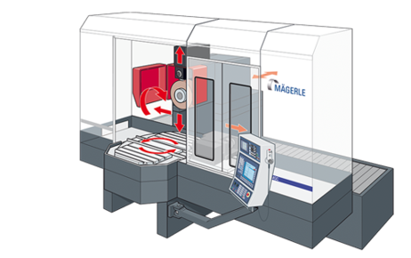 Like its sister systems in the MFP series, the Mägerle Grinding Center delivers superb results for creep feed grinding with high removal capacities as well as for profile and flat grinding. In its swivelling table version, the MGC is also designed with the maximum ejection capacity. The 180° swivelling table allows loading and unloading of workpieces while machining is in operation. Non-productive times for workpiece change are thus largely eliminated. This results in maximum productivity for small and large batches, as well as in special applications. The MGC with swivelling table, in conjunction with the automatic loading and unloading system, frees up additional reserves. The openly accessible swivelling table also provides the ideal interface.